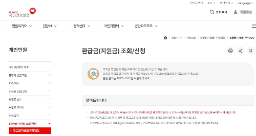 - 인터넷 접수방법 : http://www.nhis.or.kr > 통합민원서비스 > 사이버민원 > 개인민원 > 보험급여내역 및 진료받은 내용 > 본인부담금환급금 신청