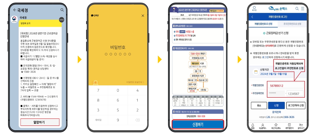 - 홈택스 접속 → 장려금·연말정산·전자기부금 → 근로장려금 반기 → 신청하기