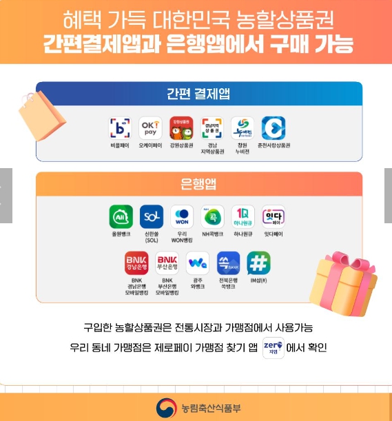 혜택 가득 대한민국 농할상품권은  간편 결제앱과 은행앱을 통해서  구매 가능합니다.