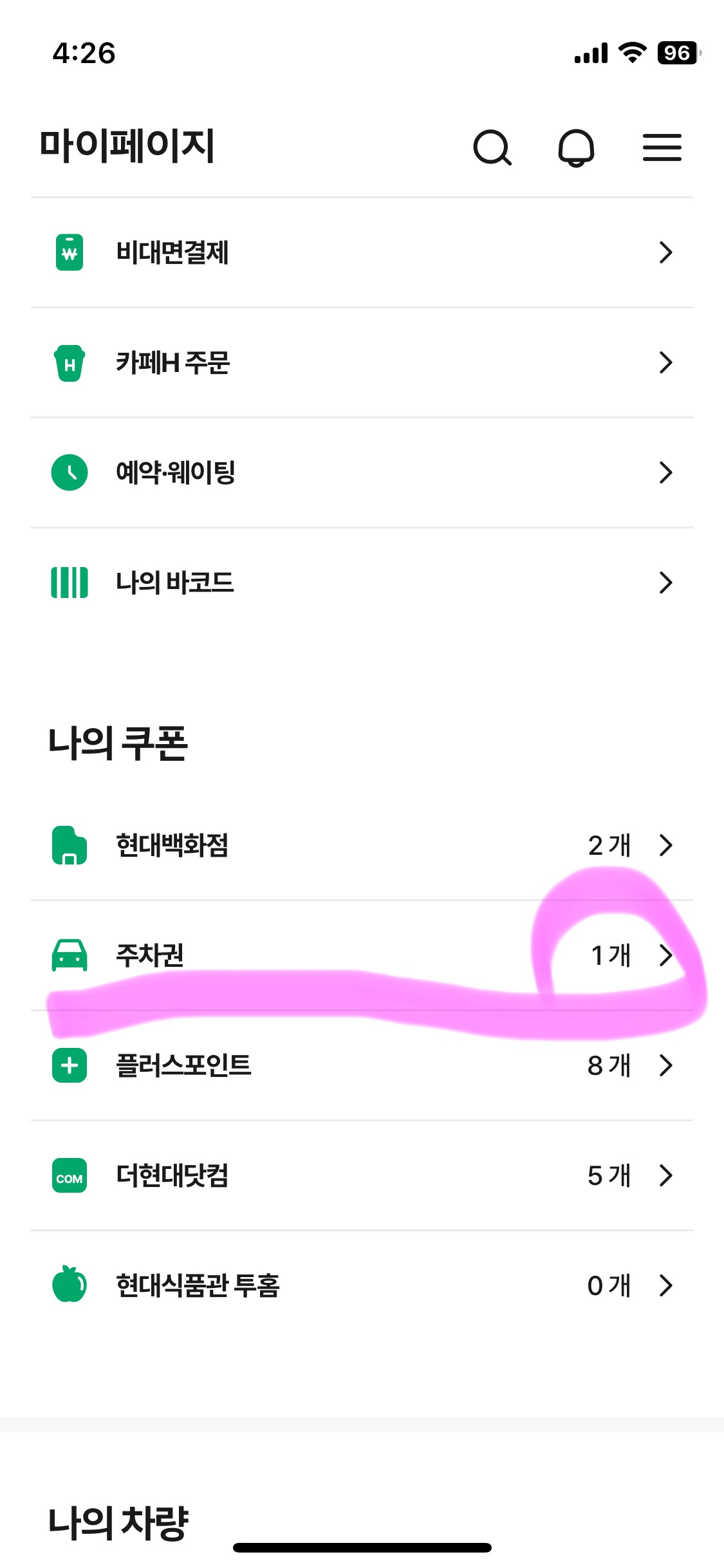 현대백화점 어플을 다운로드하고 가입 후 마이페이지에 들어가면 두 장의 무료주차권이 발급됩니다.