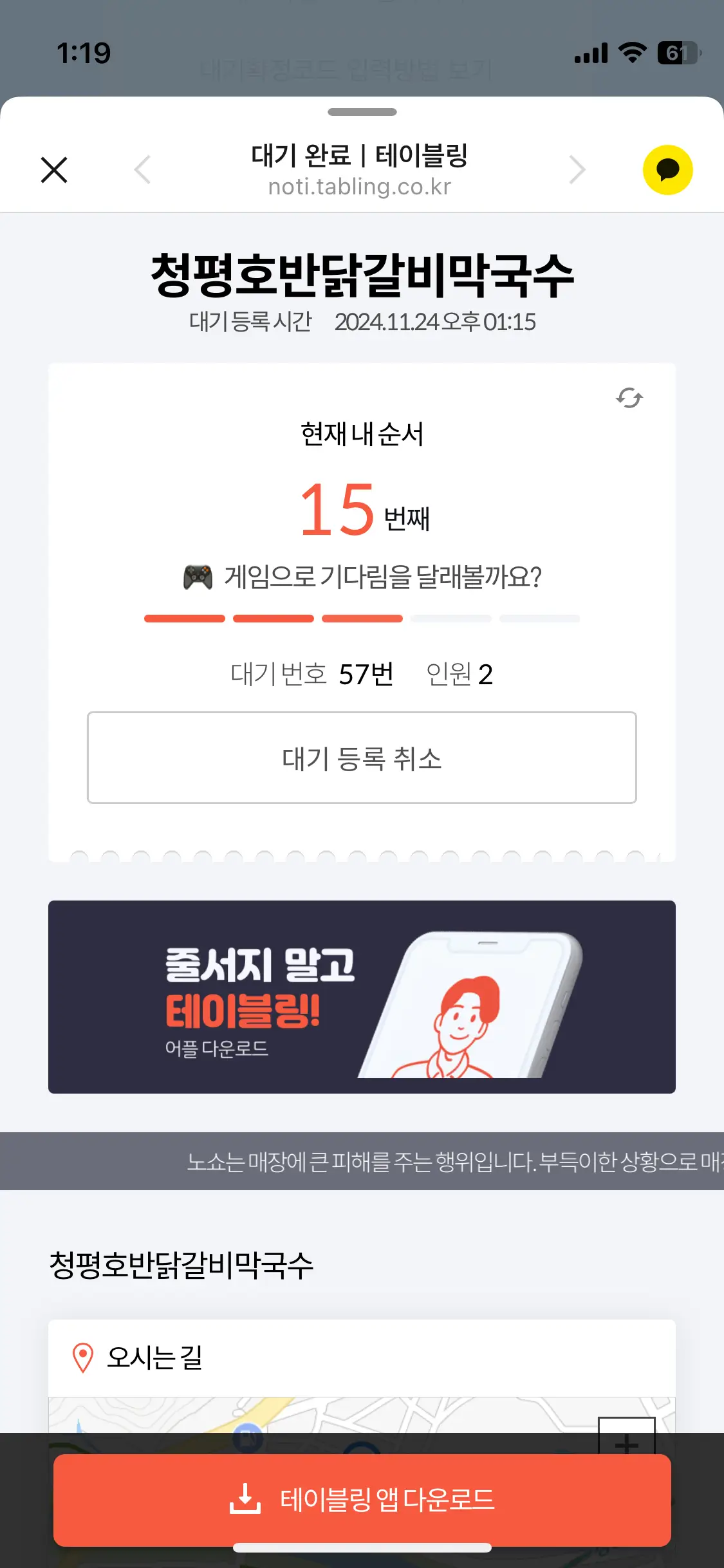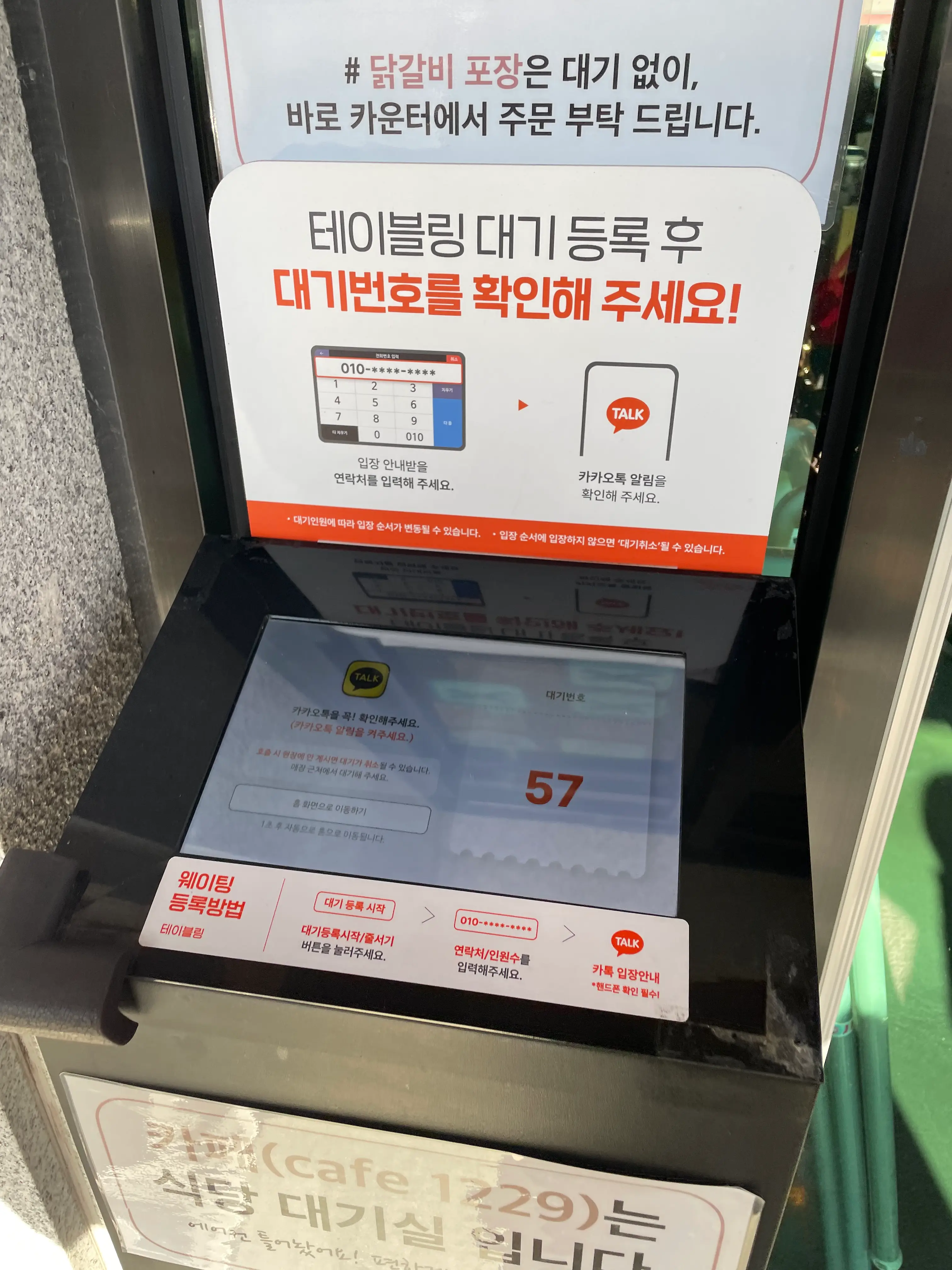 가게 앞에 있는 테이블링 대기 등록기계에 핸드폰번호를 입력하면 카카오톡으로 실시간 대기순번을 알려줍니다.