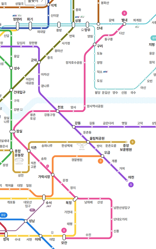 8호선 | 모란역에서 서울특별시 잠실역을 거쳐 경기도 남양주시 별내역을 잇는 도시 철도 노선 |