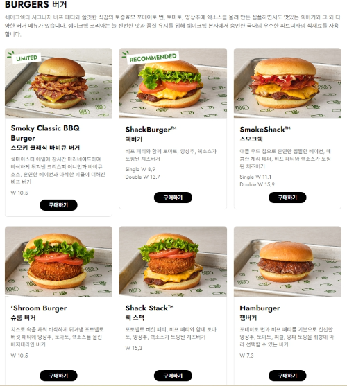쉐이크쉑은 대표메뉴인 쉑버거를 비롯해 다양한 햄버거와 사이드메뉴, 그리고 음료를 선보이고 있어요.