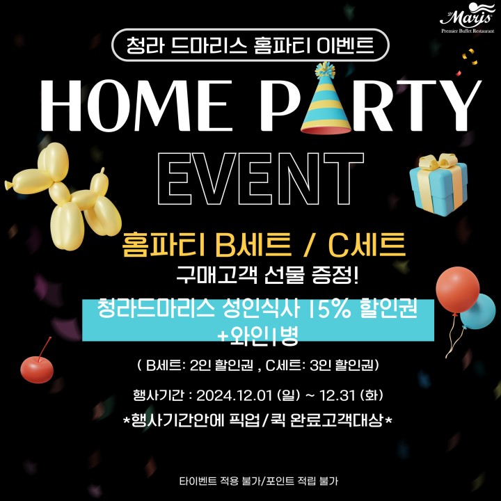 12월에는 홈파티 메뉴를 예약하시는 분들에게 식사권과 와인을 제공하는 이벤트가 있네요!