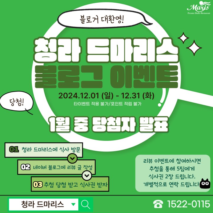 청라 드마리스에서 맛있게 식사하고 블로그를 작성하면 추첨을 해서 5팀에게 식사권을 제공한다고 합니다.