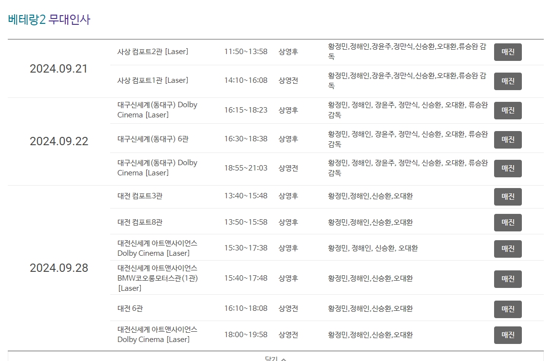 상영시간표를 검색하다 보니, 전국적으로 무대인사를 함께 볼 수 있는 상영관들도 꽤 많더라고요.